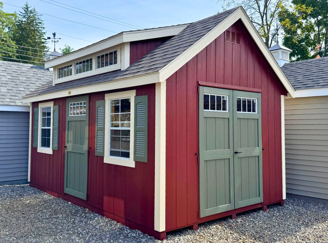 Pricing includes the following custom options: Double doors (right gable), Extra single door (front, center) $305, Transoms in all doors $375, E window upgrade $50, 3 window Mini Shed dormer $1325