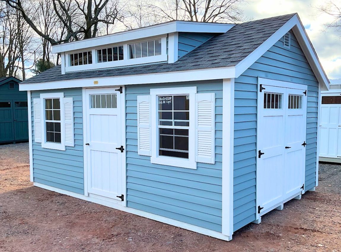 Pricing includes the following custom options: Standard layout, E window upgrade $50, 2ft work bench (left) $125, Mini shed dormer with 3 transom windows $1325
