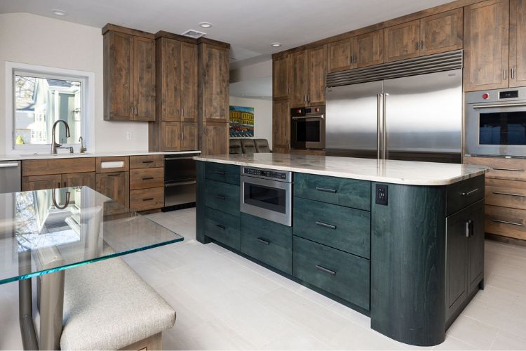 - Green island with natural wood tone uppers and lowers