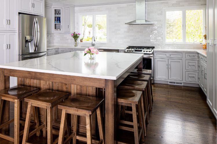 - Painted perimeter cabinets with a wood-stained island